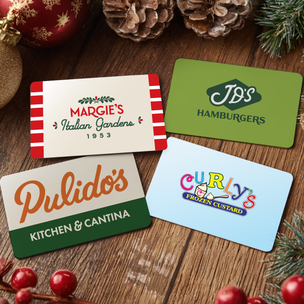 Holiday gifting feels easy when you can share the places you love most. Our Holiday Gift Card packages give you one simple purchase that supports four Fort Worth favorites. Curly’s Frozen Custard, JD’s Hamburgers, Margie’s Italian Garden, and Pulido’s Kitchen and Cantina. These cards bring local flavor to every stocking, every thank you, and every gathering this season.